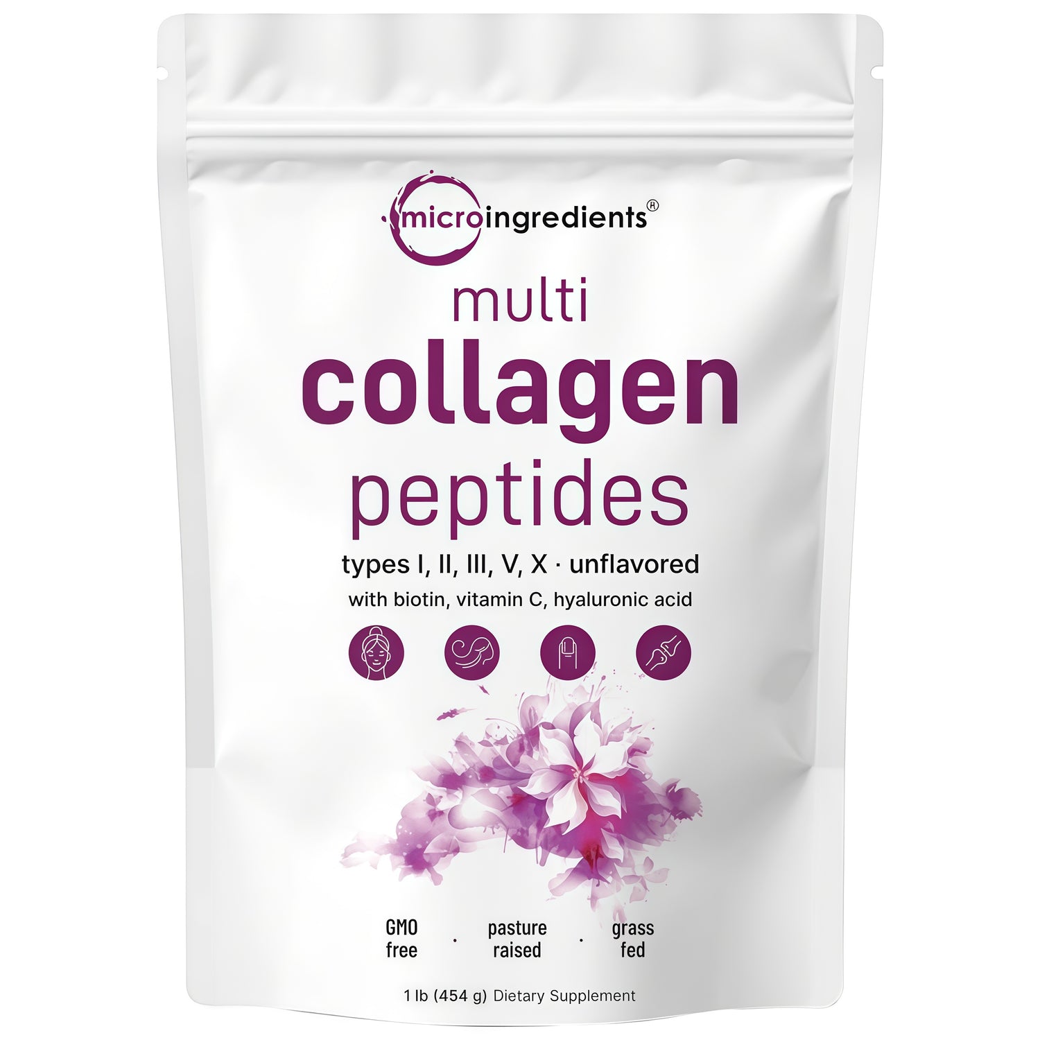 Micro Ingredients 8 in 1 full spectrum hydrolyzed collagen peptides powder. The ultimate anti-aging complex that offers up to 11g of pure pasture raised collagen peptides per serving. Created with premium hydrolyzed collagen for complete and efficient absorption that nourishes the hair, skin, nails, and joints.